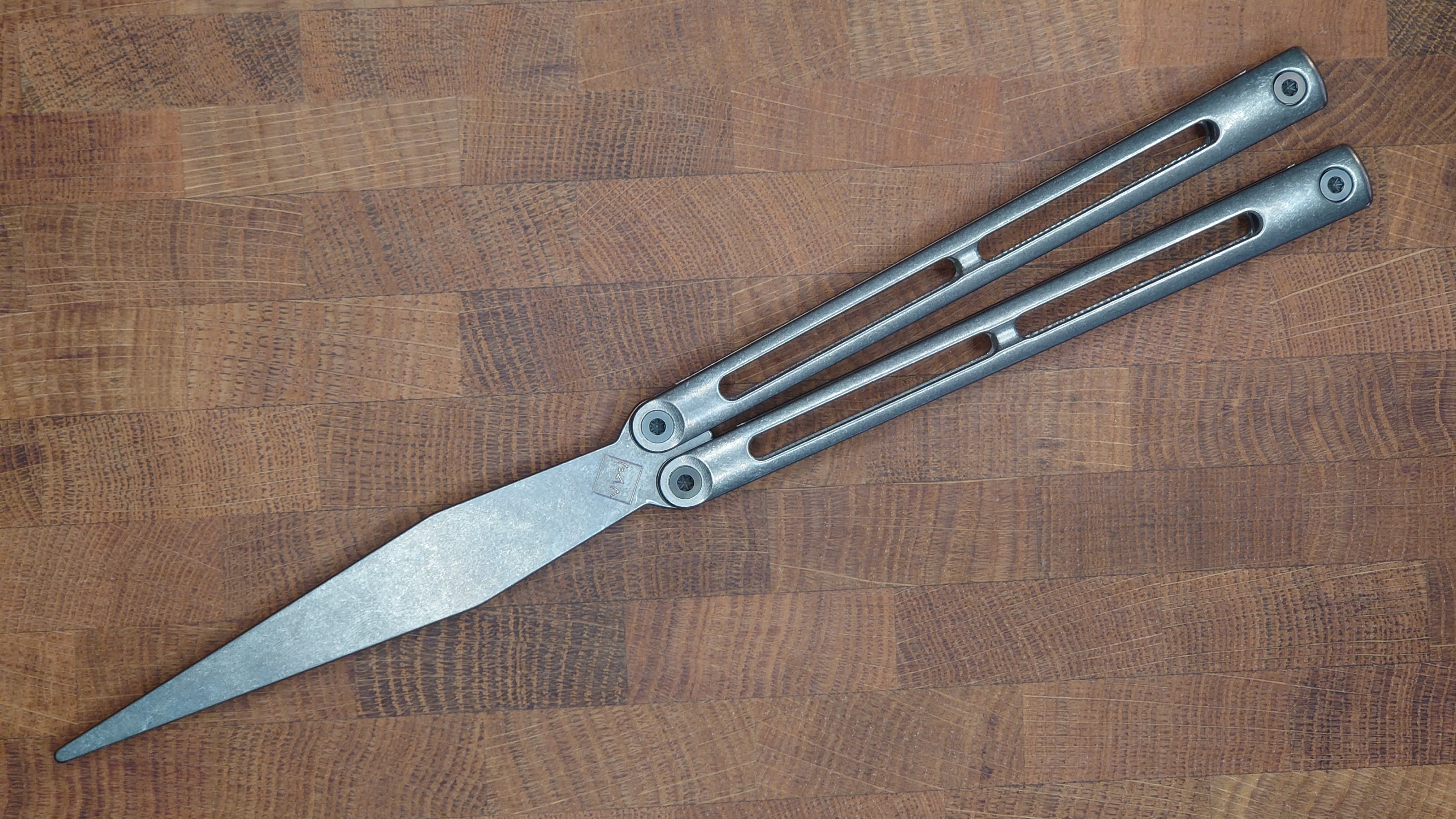 The Kuno is my flagship product, made of Titanium! It’s quite unique in that the blade is also made of titanium, and the balisong runs on a Pinsless system.